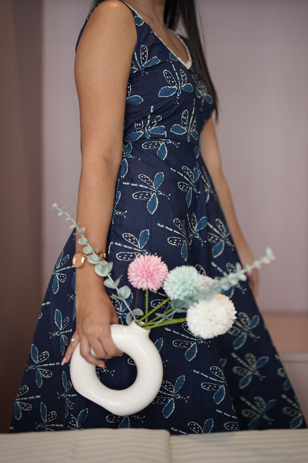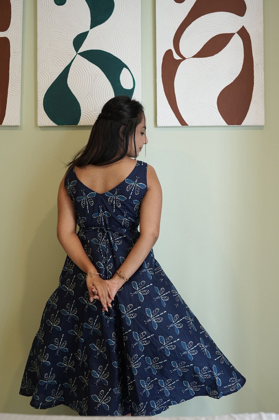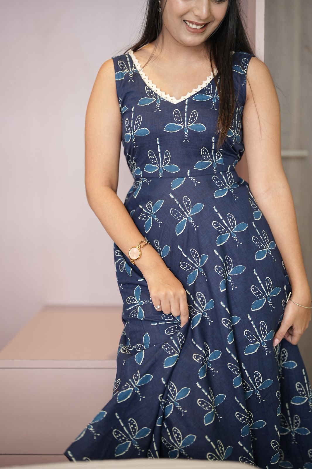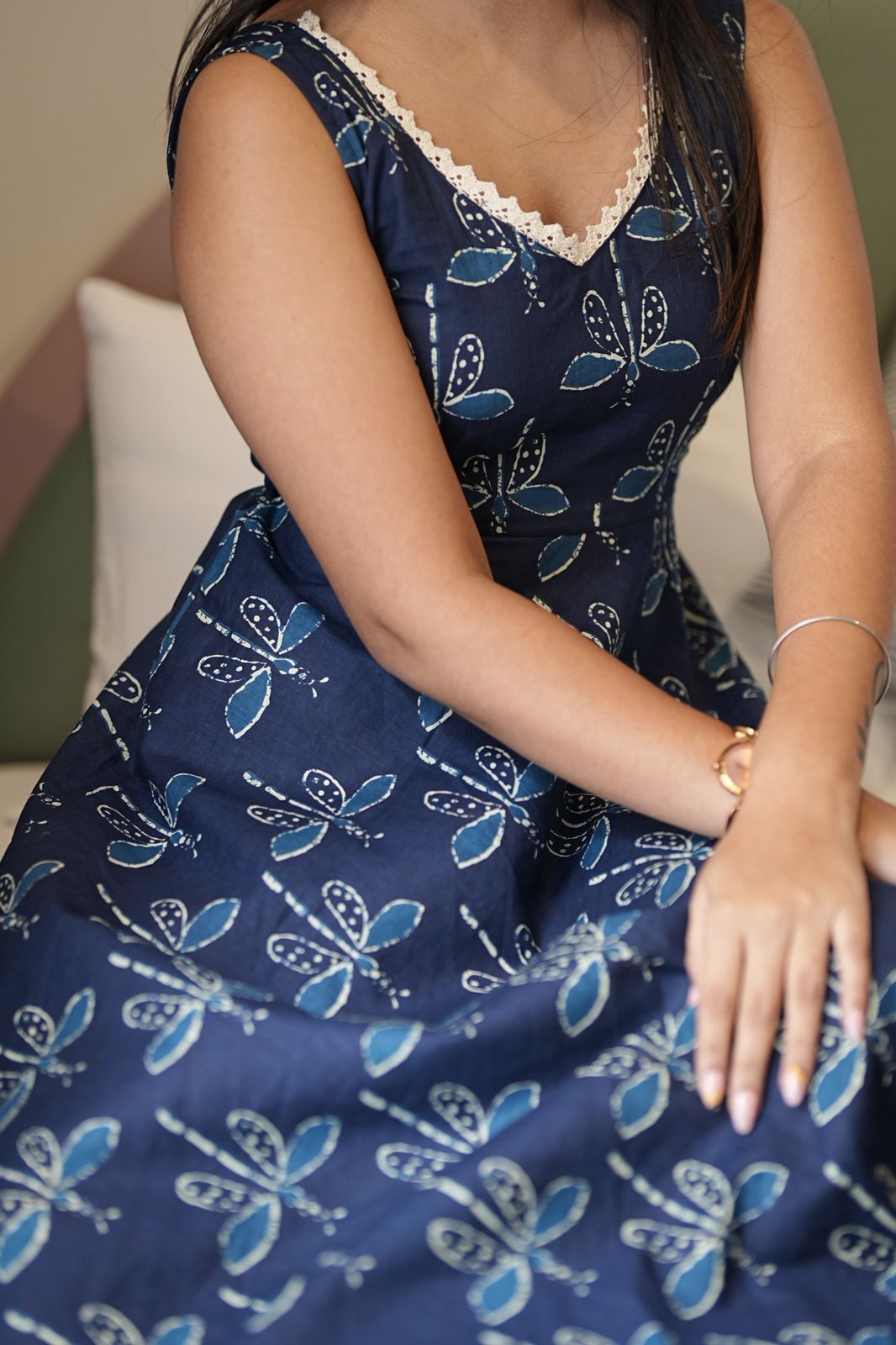A deep navy cotton dress adorned with hand block inspired butterfly prints. The sleeveless cut and delicate lace trimmed neckline give it a feminine and graceful touch. Comfortable yet elegant, Aditi is perfect for days when you want to keep it stylish without trying too hard.