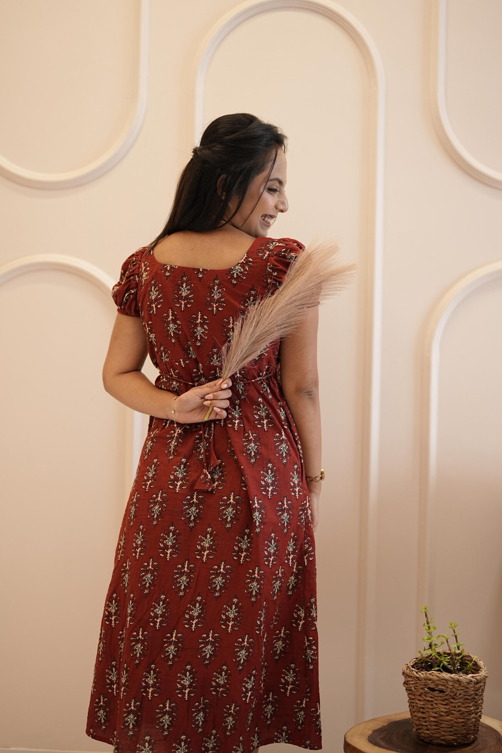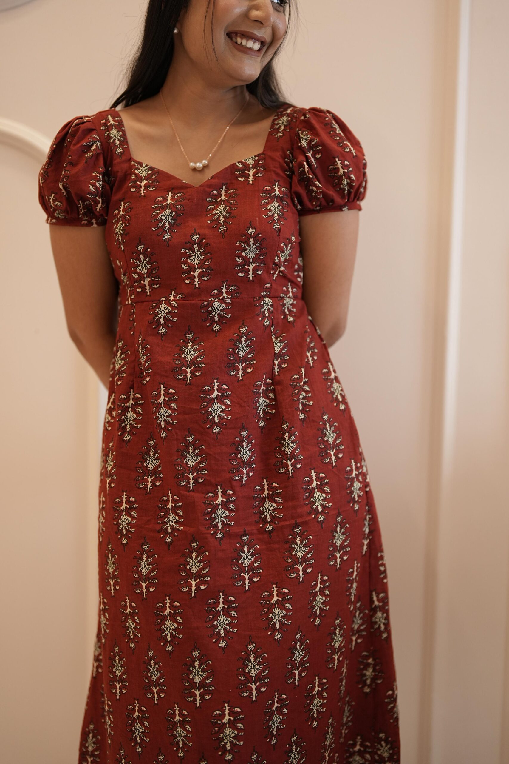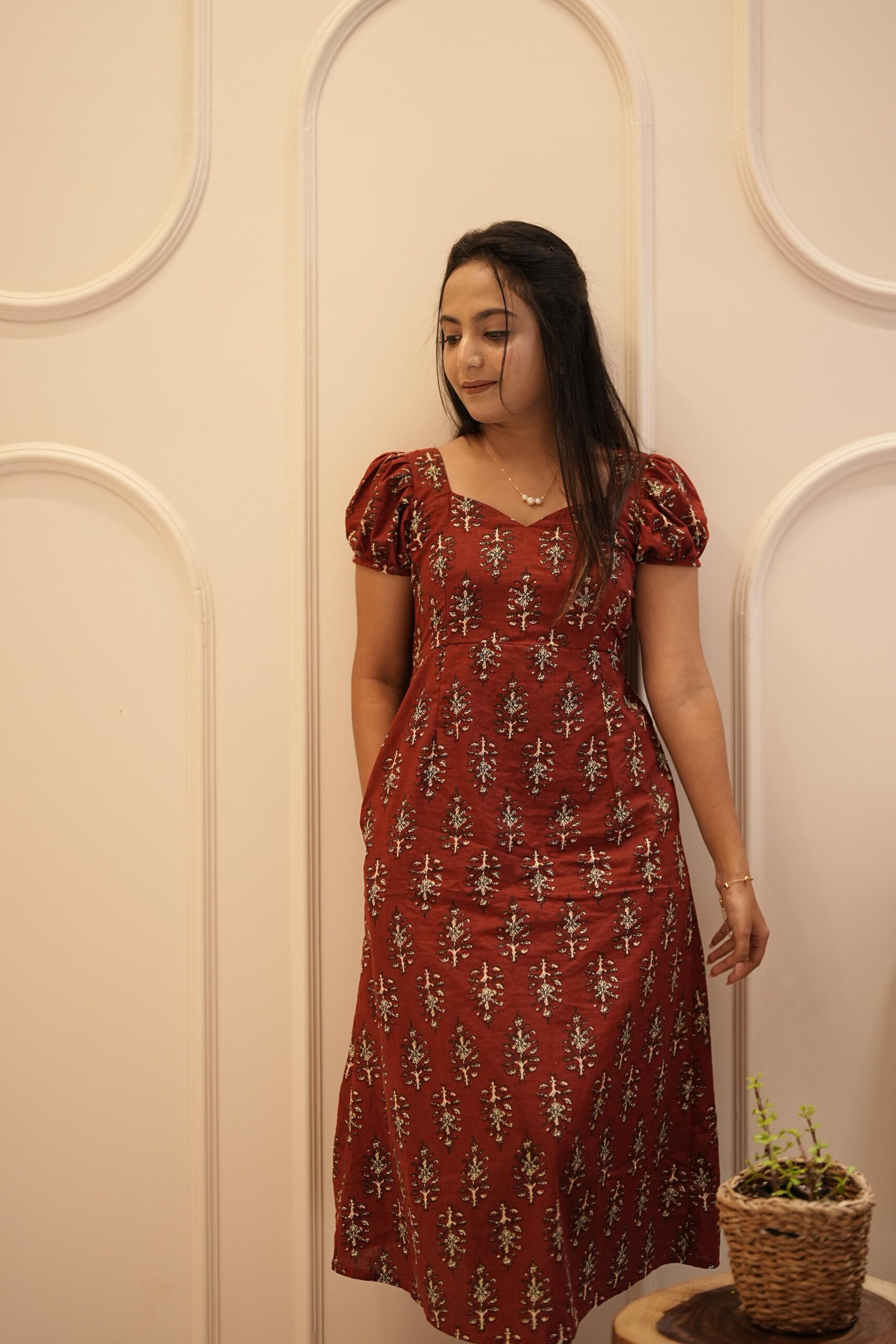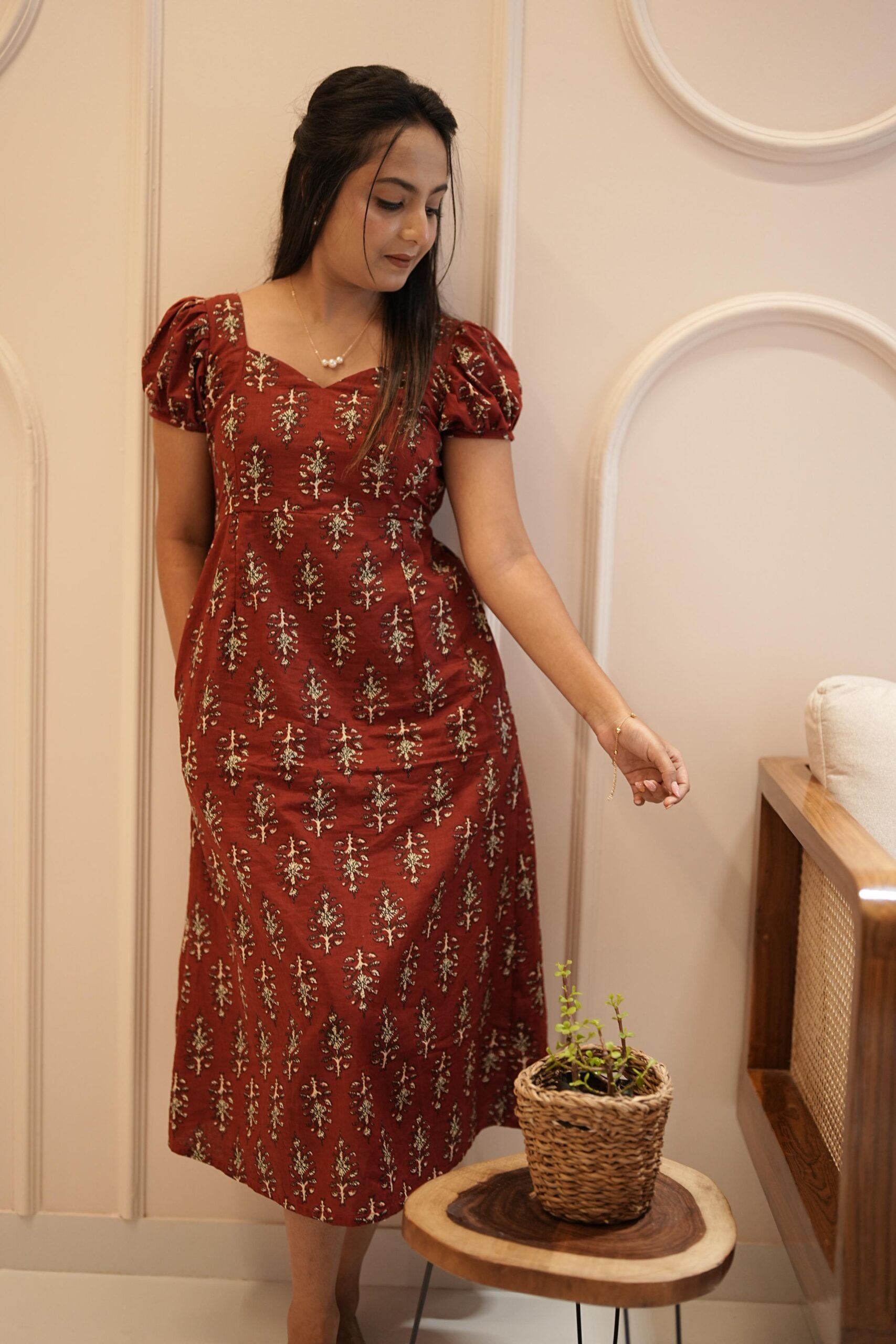 A Brown cotton dress with delicate golden floral prints. The puff sleeves and sweetheart neckline add a graceful touch while keeping it comfortable. Easy to wear for a casual day out or to dress up for a festive evening, Ankita is all about effortless charm.