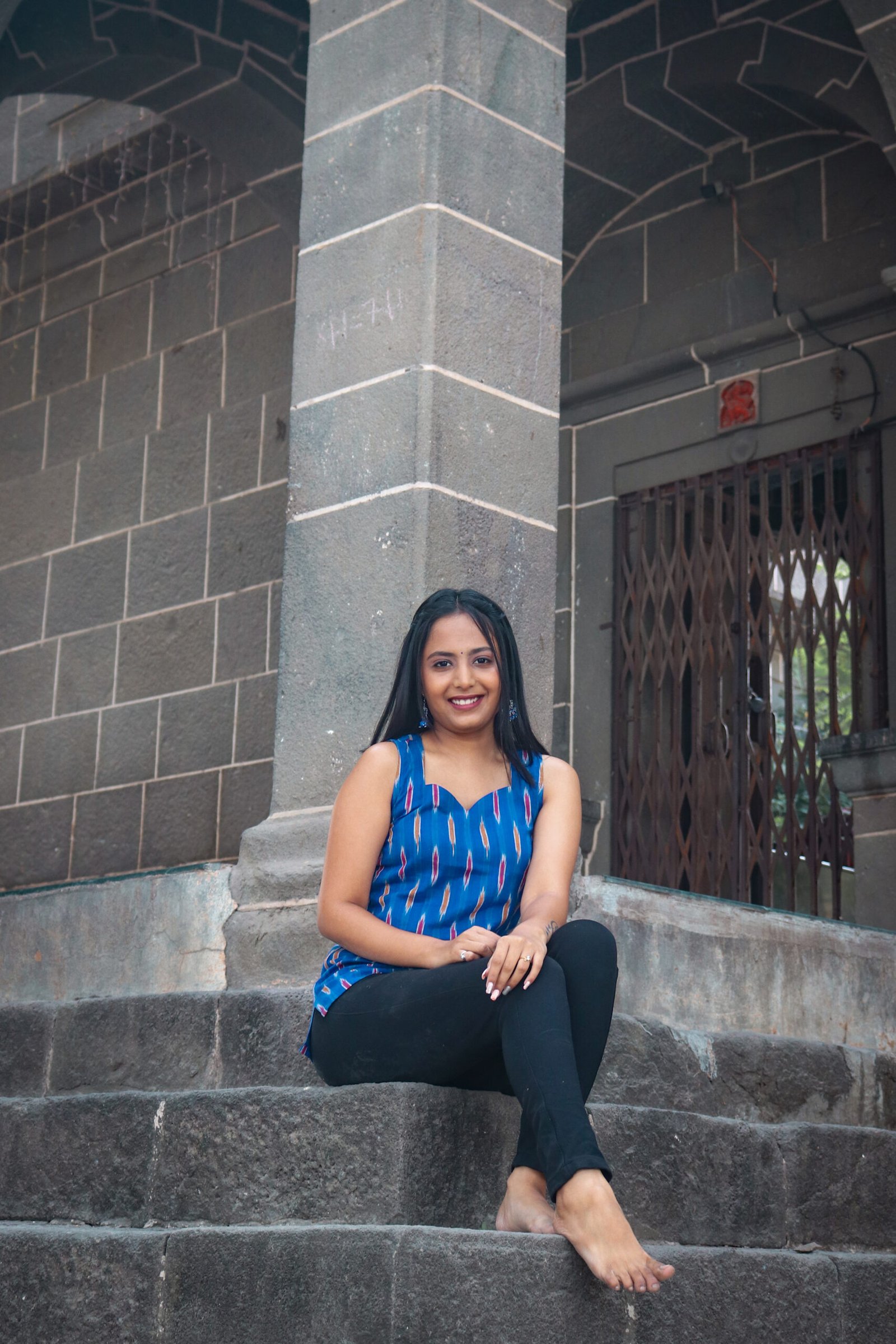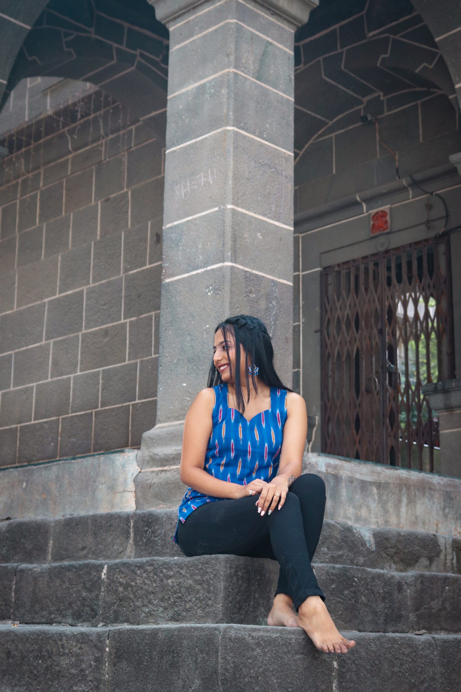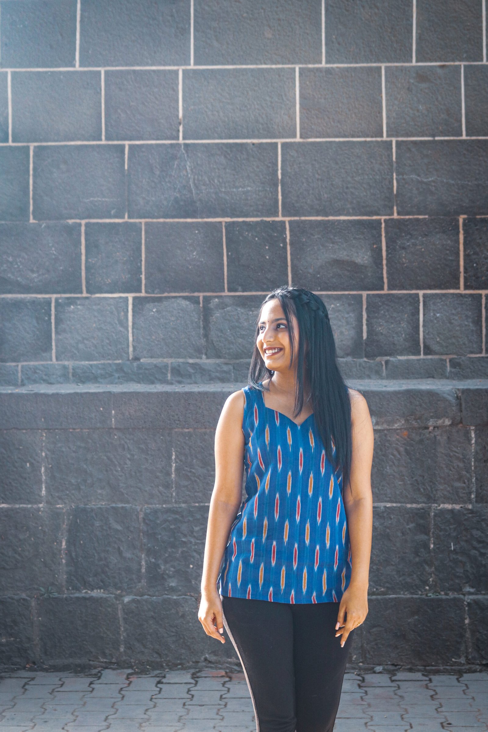 This vibrant blue ikat-patterned sleeveless top exudes a blend of modern and traditional aesthetics. Featuring an asymmetric neckline that adds an element of intrigue, the design works beautifully with sleek black bottoms. The overall ensemble is perfect for casual outings, offering a chic yet comfortable vibe. A great way to stand out while keeping it subtle!