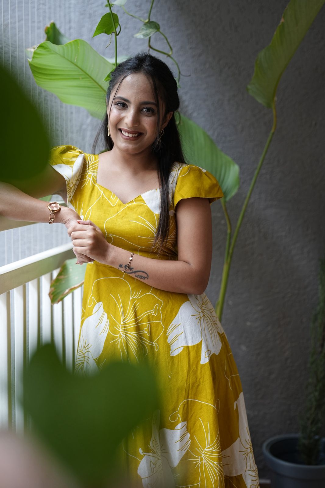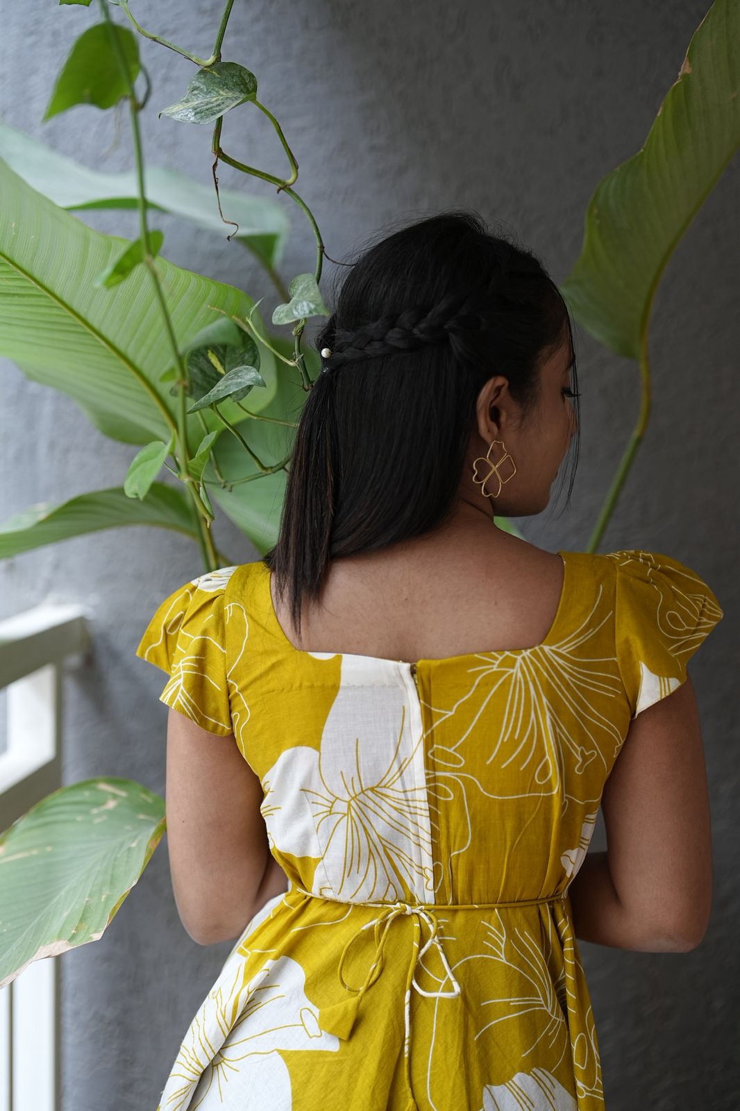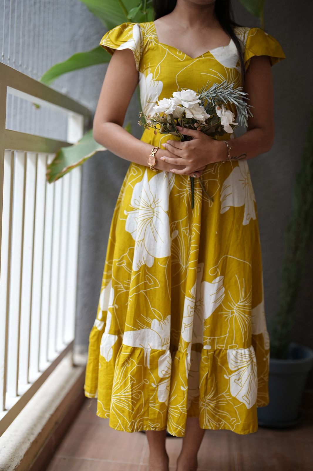 A bright mustard yellow cotton dress with bold white floral prints that radiate freshness and energy. The flutter sleeves and flared hemline add a playful charm, making it perfect for sunny days and cheerful outings. Light, breezy, and full of life, Jagruti is made to brighten your everyday style.