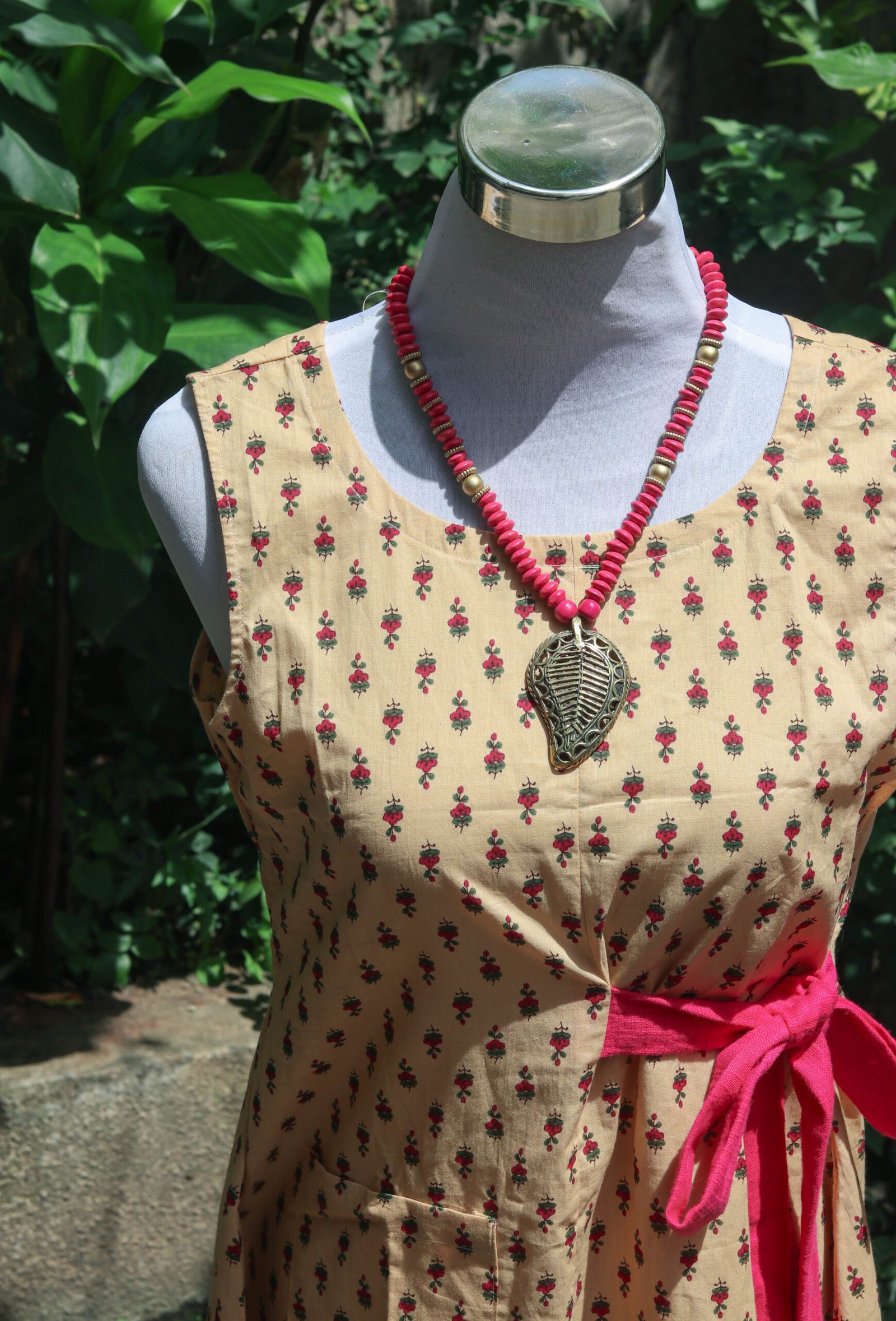 This sleeveless beige midi dress features delicate motifs and a vibrant pink waist tie that adds a pop of color. Perfectly crafted for comfort and style, it is ideal for casual outings or brunches. The lightweight fabric and flattering fit make it a wardrobe must-have.