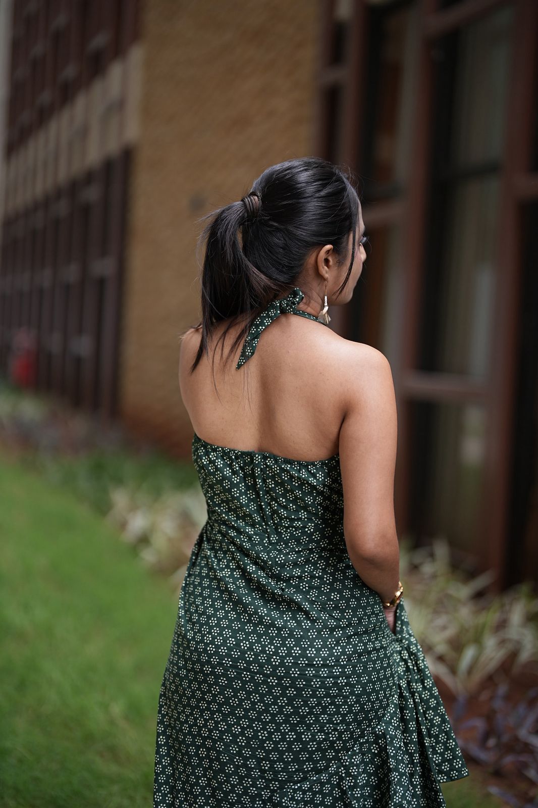 A chic green backless dress with a halter neckline and flowy asymmetrical hem. Its light fabric and playful design make it perfect for evenings, vacations, or a stylish day out. Bold, breezy, and effortlessly elegant.